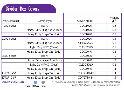 Choose from four versatile cover styles to protect your product from impact, dust and chemicals throughout your facility. Call for Pricing of Divider Box Covers