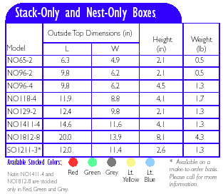 Made from fiberglass-reinforced polyester, Plexton® Stack-Only and Nest-Only containers are ideal for storing, moving and shipping small parts, as well as for autoclaves, healthcare and x-ray/security applications. They accommodate an extreme range in temperature and offer high weight capacity. Thin-wall design and construction gives maximum strength while remaining lightweight.